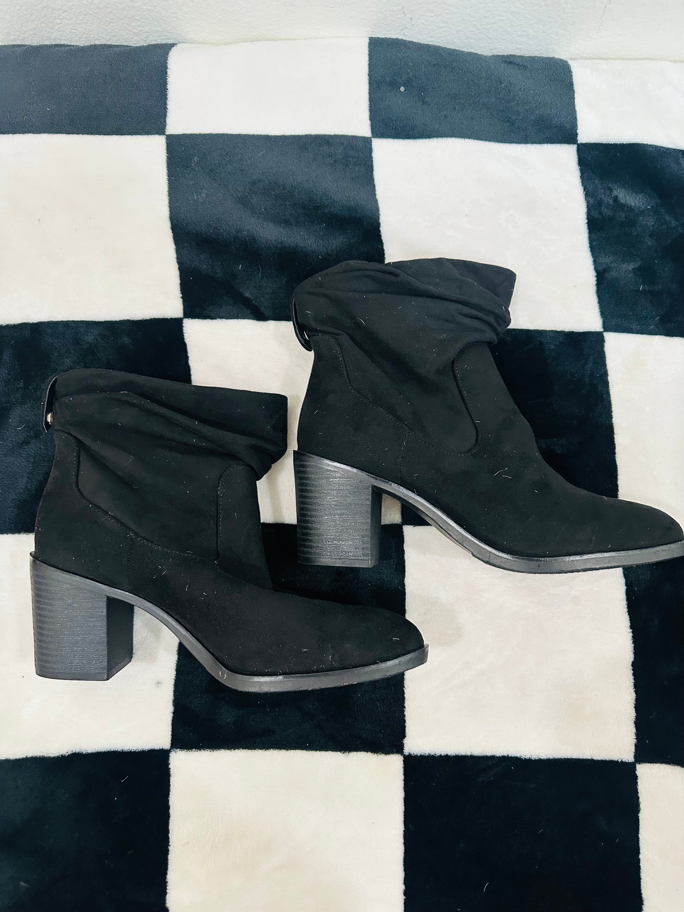CHINESE LAUNDRY BOOTIES With button detail on back can fold down or leave up . Soft material and slip grip bottoms. Ruched top. Cute with any outfit.